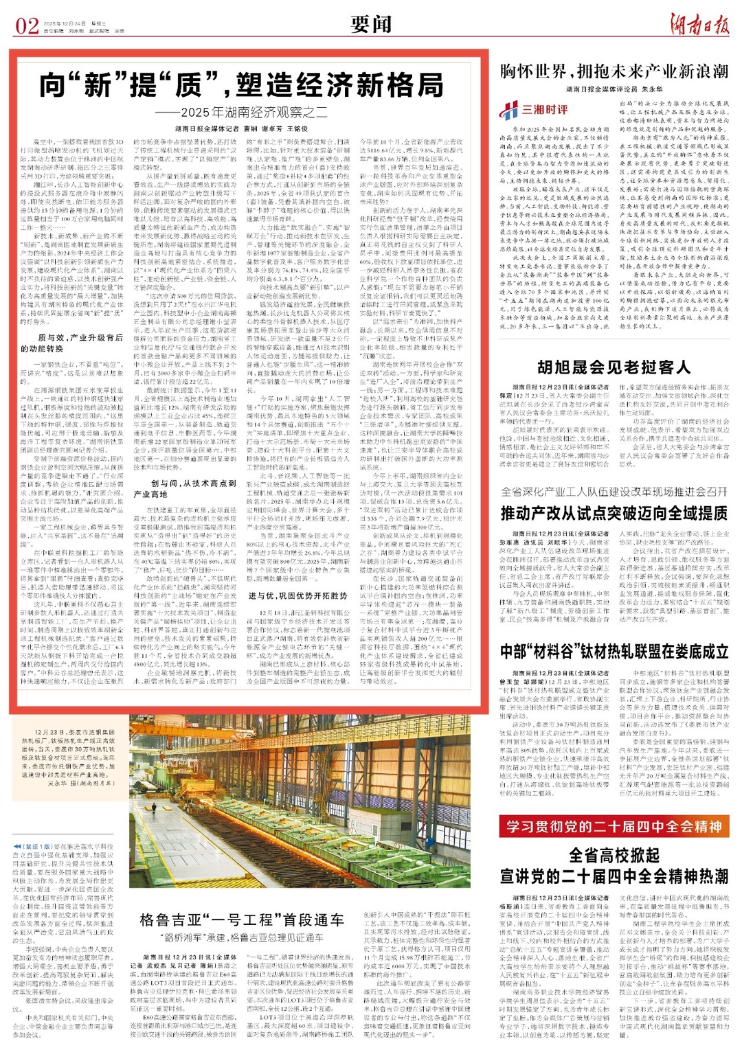 新技术、新成果、新产业的不断“刷新”,是湖南因地制宜发展新质生产力的缩影。2024年中央经济工作会议强调“以科技创新引领新质生产力发展,建设现代化产业体系”。湖南以时不我待的紧迫感,以技术创新强产业实力,将科技创新的“关键变量”转化为高质量发展的“最大增量”,加快构建具有湖南特色的现代化产业体系,持续巩固拓展全省向“新”提“质”的好势头。